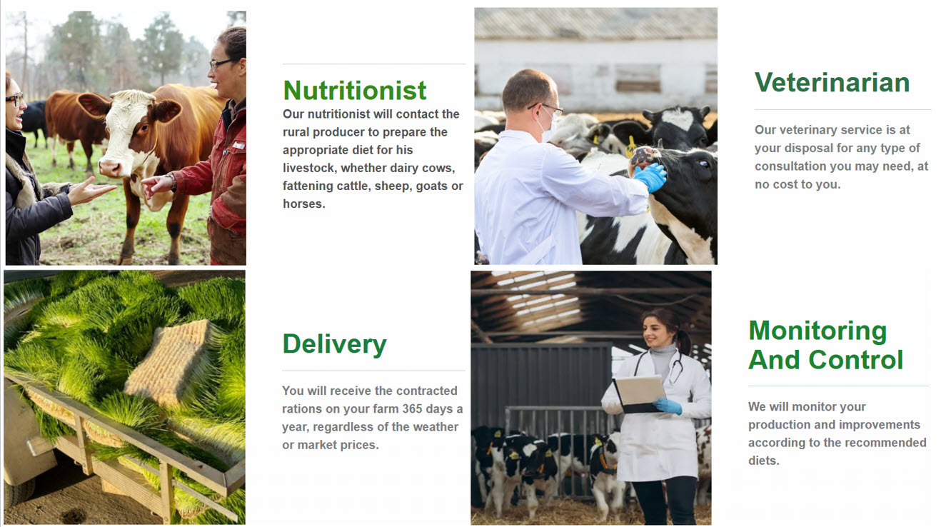 Hydroponic fodder is a balanced, high-quality source of nutrients, rich in proteins, vitamins and minerals essential for animal growth and health. Its protein content is higher than that of many traditional fodders, which helps to cover nutritional requirements efficiently. In addition, its digestibility is exceptionally high, allowing for better absorption of nutrients in the digestive tract, optimizing feed conversion and promoting healthy weight gain in measurable less time.A feed contract with our company will offer you numerous advantages: continuous access to fresh, high-quality hydroponic forage, guarantee of a constant and balanced nutritional profile for your animals, cost reduction by optimizing feed conversion and improving weight gain, reduced environmental impact by reducing methane emissions, and a stable supply without depending on weather conditions. In addition, your livestock will enjoy better health and well-being, which will increase their productivity and the profitability of you livestock operation